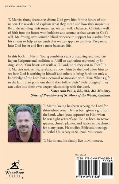 T. Martin Young shares the visions God gave him for the future of our nation. He reveals and explains what they mean and how they impact us. By understanding their meanings, we can walk a balanced Christian walk of faith into the future with boldness and assurance that we are in God's will. Mr. Young gives sound biblical evidence to support his insights from his visions to help us see truth that we can apply to our lives. Prepare to hear God better and live a more balanced life. In this book T. Martin Young combines years of studying and meditating on Scripture and tradition to fulfill an aspiration expressed by St. Augustine, "Our hearts are restless, O Lord, until they rest in Thee." In T. Martin's unique life, revelations shown him by the Lord allow him to see how God is working in himself and others to bring forth not only a knowledge of the Lord but a personal relationship with Him. What a gift to the faithful to point out that if they follow their "Holy Longing" they can delve into their own deeper relationship with the Lord. - Sister Ann Paula, BS., MA, MA Ministry. Sister of Providence of St. Mary of the Woods, Indiana.