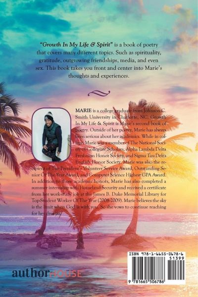 "Growth In My Life & Spirit" is a book of poetry that covers many different topics. Such as spirituality, gratitude, outgrowing friendships, media, and even sex. This book takes you front and center into Marie's thoughts and experiences.
