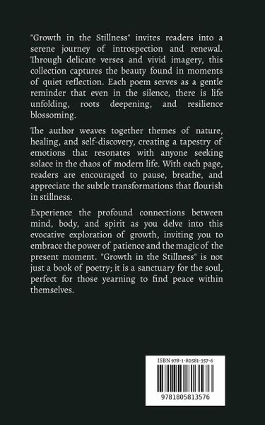 "Growth in the Stillness" invites readers into a serene journey of introspection and renewal. Through delicate verses and vivid imagery, this collection captures the beauty found in moments of quiet reflection. Each poem serves as a gentle reminder that even in the silence, there is life unfolding, roots deepening, and resilience blossoming. The author weaves together themes of nature, healing, and self-discovery, creating a tapestry of emotions that resonates with anyone seeking solace in the chaos of modern life. With each page, readers are encouraged to pause, breathe, and appreciate the subtle transformations that flourish in stillness. Experience the profound connections between mind, body, and spirit as you delve into this evocative exploration of growth, inviting you to embrace the power of patience and the magic of the present moment. "Growth in the Stillness" is not just a book of poetry; it is a sanctuary for the soul, perfect for those yearning to find peace within themselves.