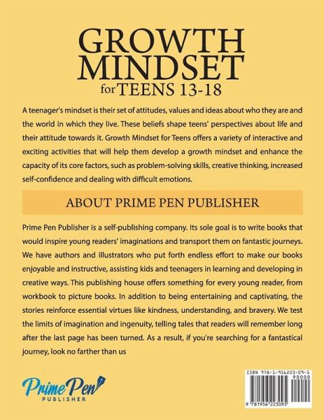 Do you know your brain "remodels" during the adolescent years? A procedure that aids in developing a stronger, more functional brain will help you become a self-sufficient adult. Admittedly, this remodeling includes irrational emotional reactions, reckless behavior, pushing boundaries, and irregular impulse control. When you were younger, you absorbed information and had more concrete thoughts. You can now see things more abstractly because you are a teenager. You can approach problems more creatively and think critically about yourself and others. It also implies that you might have strong opinions, be idealistic, and challenge the "traditional methods" of doing things. This book offers a wide range of ü Intriguing, fun ideas for engaging activities for teens to develop a growth mindset that will surely surprise them.ü Teens can learn how to enhance the capacity of core factors, such as problem-solving skills, creative thinking, increased self-confidence and dealing with difficult emotions.Adolescents with a fixed mindset think that their character qualities, intelligence, and creativity are fixed at birth and that nothing they do would significantly alter those characteristics. A growth mindset, rooted in the conviction that intelligence can develop and be enhanced with effort, is supported by praise that emphasizes effort (e.g., "You've worked extremely hard on that!"). Youngsters with a growth mentality think they can attain what they want if they work hard and put in the time to do it.The following activities are incorporated into this book to practice a growth mindset: · Reflection sheets, · Self-assessment worksheets, · Fascinating positive talk tools, · Facts and Solutions and much moreIf you really wish to develop a growth mentality, click "Buy Now" and take the first step towards developing a positive and problem solving attitude.