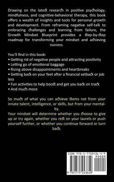 Drawing on the latest research in positive psychology, mindfulness, and cognitive-behavioral therapy, this book offers a wealth of insights and tools for personal growth and development. From reframing negative self-talk to embracing challenges and learning from failure, the Growth Mindset Blueprint provides a step-by-step roadmap for transforming your mindset and achieving success. You'll find in this book:Getting rid of negative people and attracting positivity Letting go of emotional baggage Rising above disappointments and heartbreaks Getting back on your feet after a financial setback or job less Fun activities to help boost and get you back on track And much more So much of what you can achieve stems not from your innate talent, intelligence, or skills, but from your mentality. Your mindset will determine whether you choose to give up or try again, whether you rest on your laurels or push yourself further, or whether you continue forward or turn back.