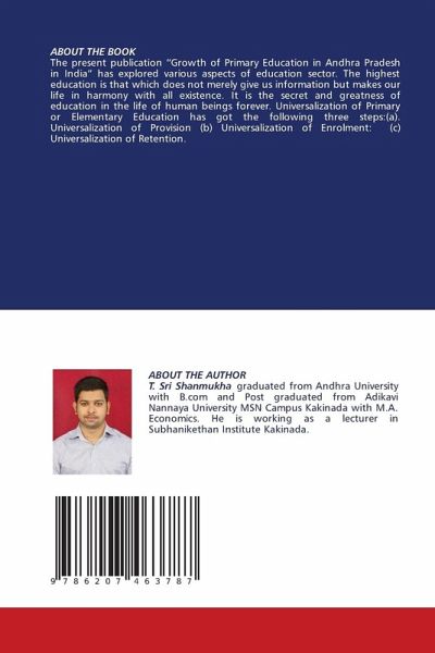ABOUT THE BOOKThe present publication "Growth of Primary Education in Andhra Pradesh in India" has explored various aspects of education sector. The highest education is that which does not merely give us information but makes our life in harmony with all existence. It is the secret and greatness of education in the life of human beings forever. Universalization of Primary or Elementary Education has got the following three steps:(a). Universalization of Provision (b) Universalization of Enrolment: (c) Universalization of Retention.