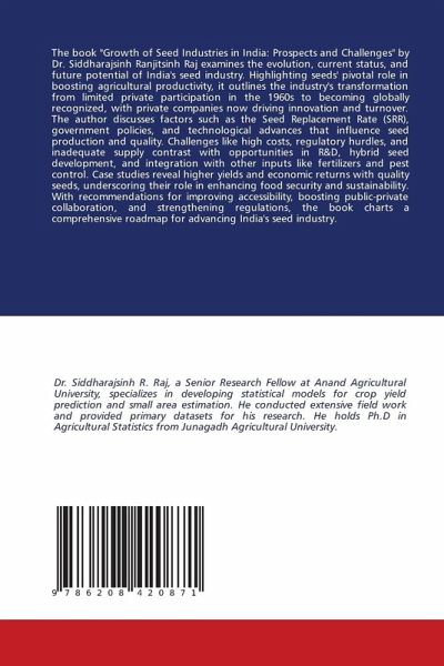 The book "Growth of Seed Industries in India: Prospects and Challenges" by Dr. Siddharajsinh Ranjitsinh Raj examines the evolution, current status, and future potential of India's seed industry. Highlighting seeds' pivotal role in boosting agricultural productivity, it outlines the industry's transformation from limited private participation in the 1960s to becoming globally recognized, with private companies now driving innovation and turnover. The author discusses factors such as the Seed Replacement Rate (SRR), government policies, and technological advances that influence seed production and quality. Challenges like high costs, regulatory hurdles, and inadequate supply contrast with opportunities in R&D, hybrid seed development, and integration with other inputs like fertilizers and pest control. Case studies reveal higher yields and economic returns with quality seeds, underscoring their role in enhancing food security and sustainability. With recommendations for improving accessibility, boosting public-private collaboration, and strengthening regulations, the book charts a comprehensive roadmap for advancing India's seed industry.