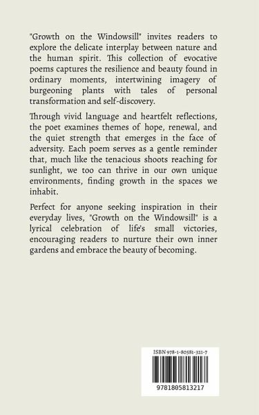 "Growth on the Windowsill" invites readers to explore the delicate interplay between nature and the human spirit. This collection of evocative poems captures the resilience and beauty found in ordinary moments, intertwining imagery of burgeoning plants with tales of personal transformation and self-discovery. Through vivid language and heartfelt reflections, the poet examines themes of hope, renewal, and the quiet strength that emerges in the face of adversity. Each poem serves as a gentle reminder that, much like the tenacious shoots reaching for sunlight, we too can thrive in our own unique environments, finding growth in the spaces we inhabit. Perfect for anyone seeking inspiration in their everyday lives, "Growth on the Windowsill" is a lyrical celebration of life's small victories, encouraging readers to nurture their own inner gardens and embrace the beauty of becoming.
