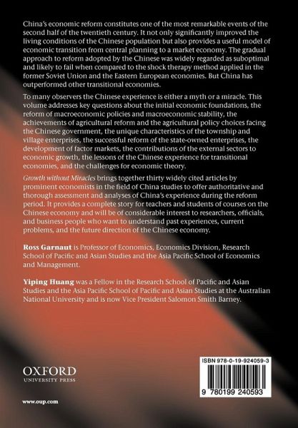 China's economic reform constitutes one of the most remarkable events of the second half of the twentieth century. It not only significantly improved the living conditions of the Chinese population but also provides a useful model of economic transition from central planning to a market economy. The gradual approach to reform adopted by the Chinese was widely regarded as suboptimal and likely to fail when compared to the shock therapy method applied in the former Soviet Union and the Eastern European economies. But China has out-performed other transitional economies. To many observers the Chinese experience is either a myth or a miracle. This volume addresses key questions about the initial economic foundations, the reform of macroeconomic policies and macroeconomic stability, the achievements of agricultural reform and the agricultural policy choices facing the Chinese government, the unique characteristics of the township and village enterprises, the successful reform of the state-owned enterprises, the development of factor markets, the contributions of the external sectors to economic growth, the lessons of the Chinese experience for transitional economies, and the challenges for economic threory. Growth without Miracles brings together thirty widely cited articles by prominent economists in the field of China studies to offer authoritative and through assessment and analyses of Chinas experience during the reform period. It provides a complete story for teachers and students of courses on the Chinese economy and will be of considerable interest to researchers, officials, and business people who want to understand past experiences, current problems, and the future direction of the Chinese economy.