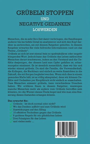 Menschen, die zu sehr Ihre Zeit damit verbringen, die Handlungen anderer bis ins tiefste Detail zu analysieren und sich den Kopf darüber zu zerbrechen, sei mit diesem Ratgeber geholfen. In diesem Ratgeber erwarten Sie viele hilfreiche Informationen rund um das Thema ,,Grübeln''. Grübeln an sich ist erst einmal kein so spektakuläres oder negativ klingendes Wort. Jedoch kann das Grübeln das Leben zahlreicher Menschen derart erschweren, indem es den Verstand und die Gefühle desjenigen, der diesem Leid zum Opfer gefallen ist, erbarmungslos einnimmt. Es ist ziemlich menschlich, dass wir hin und wieder einmal grübeln. Da sind die Familie, die Verwandtschaft, die Kollegen, die Nachbarn und einfach zu weite Aussichten in die Zukunft, die mit Sorgen begleitet werden. Wenn sich dies in einem gesunden Maße hält, ist es völlig akzeptabel, denn wir können Gefühle und Gedanken per Knopfdruck nicht einfach so ausschalten. Dass Menschen exzessiv grübeln, kann verschiedene Ursachen haben. Wir erklären Ihnen in diesem Ratgeber, weswegen manche Menschen mehr als andere vom Grübeln betroffen sein könnten, wo die Wurzel dieses Übels lieget und wie man eine Besserung dieses Zustandes erlangen könnte. Das erwartet Sie:-Grübeln - Ist doch normal oder nicht?-Wo das Denken aufhört und zum Grübeln wird-Auswirkungen auf den Alltag-10 effektive Techniken gegen das Grübeln-8 goldene Regeln für ein glückliches Leben-Drei Prinzipien für das Lebenund vieles mehr ...