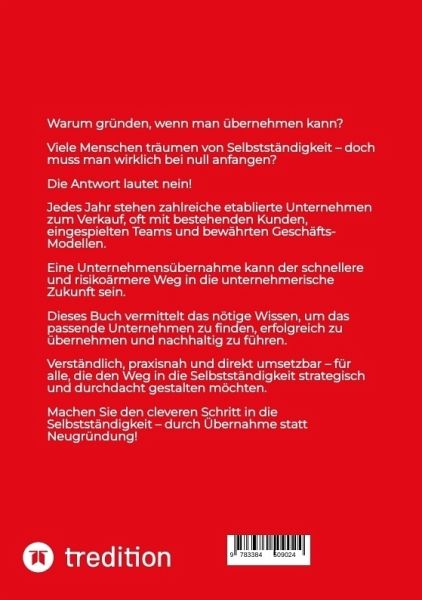 Warum gründen, wenn man übernehmen kann?Viele Menschen träumen von der Selbstständigkeit - doch muss man wirklich bei null anfangen? Die Antwort lautet nein! Jedes Jahr stehen zahlreiche etablierte Unternehmen zum Verkauf, oft mit bestehenden Kunden, eingespielten Teams und bewährten Geschäftsmodellen. Eine Unternehmensübernahme kann der schnellere und risikoärmere Weg in die unternehmerische Zukunft sein.Dieses Buch vermittelt das nötige Wissen, um das passende Unternehmen zu finden, erfolgreich zu übernehmen und nachhaltig zu führen. Verständlich, praxisnah und direkt umsetzbar - für alle, die den Weg in die Selbstständigkeit strategisch und durchdacht gestalten möchten.