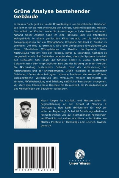 In diesem Buch geht es um die Umweltanalyse von bestehenden Gebäuden. Wie können wir die Verschwendung von Energie, Abfallmanagement, Wasser, Gesundheit und Komfort sowie die Auswirkungen auf die Umwelt erkennen. Anhand dieser Aspekte habe ich eine Fallstudie über ein öffentliches Wohngebäude in einem gemischten Klima erstellt, um die wichtigsten Energieprognosen für ein Wohngebäude (tragende Struktur) in Gwalior zu ermitteln. Um dies zu erreichen, wird eine umfassende Energiebewertung eines öffentlichen Wohngebäudes in Gwalior durchgeführt. Unter Nachrüstung versteht man den Prozess, etwas zu verändern, nachdem es hergestellt wurde. Bei Gebäuden bedeutet dies, dass die Systeme innerhalb des Gebäudes oder sogar die Struktur selbst zu einem bestimmten Zeitpunkt nach dem ursprünglichen Bau und der Nutzung verändert werden. Die Nachrüstung bestehender Gebäude dient der Verbesserung der Nachhaltigkeit und der Energieeffizienz. Grüne Praktiken in bestehenden Gebäuden können dazu beitragen, nationale Probleme wie Wassereffizienz, Energieeffizienz, Verringerung des Verbrauchs fossiler Brennstoffe im Verkehr, Abfallbehandlung und Erhaltung natürlicher Ressourcen anzugehen. Vor allem aber können diese Konzepte die Gesundheit, die Zufriedenheit und das Wohlbefinden der Bewohner verbessern.