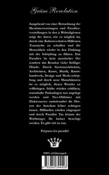 Grüne RevolutionAusgehend von einer Betrachtung der Messiaserwartungen und Paradiesvorstellungen in den 5 Weltreligionen zeigt der Autor, wie es möglich ist, durch eine Kulturrevolution Millionen Traumjobs zu schaffen und die Menschheit wieder in den Einklang mit der Schöpfung zu führen. Das Paradies ist kein mystischer Ort sondern das Resultat vieler fleißiger Hände. Durch Gartenarchitektur, Architekten, Kunst, Musik, Kunsthandwerk, Design und Modeschöpfung und durch neue Manufakturen ist es möglich, dieses Wunder zu vollbringen. Städte würden erblühen, traumhafte Parkanlagen neu angelegt werden und Neo-Oldtimer mit Elektromotor emissionsfrei die Herzen der Autofans höher schlagen lassen. Milliarden würden eingespart und die Not und das Elend in der Welt beendet werden. Es gibt viel zu tun. Préparez lez paradis!