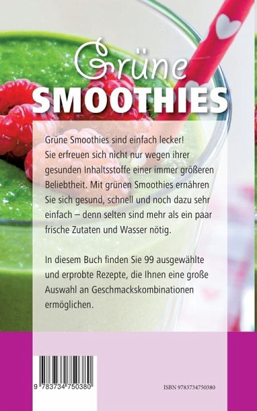 Grüne Smoothies sind einfach lecker! Sie erfreuen sich nicht nur wegen ihrer gesunden Inhaltsstoffe einer immer größeren Beliebtheit. Mit grünen Smoothies ernähren Sie sich gesund, schnell und noch dazu sehr einfach - denn selten sind mehr als ein paar frische Zutaten und Wasser nötig.In diesem Buch finden Sie 99 erprobte Rezepte, die Ihnen eine große Auswahl an Geschmackskombinationen ermöglichen.