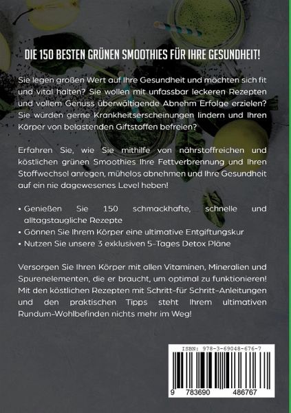 Grüne Smoothies: 150 unschlagbar leckere Rezepte inklusive Nährwertangaben + 3 effektive 5-Tages-Pläne für den maximalen Erfolg - Werden Sie mit unseren Power Smoothies zur schlanksten und gesündesten Version Ihrer selbst! Sie legen großen Wert auf Ihre Gesundheit und möchten sich fit und vital halten? Sie wollen mit unfassbar leckeren Rezepten und vollem Genuss überwältigende Abnehm Erfolge erzielen? Sie würden gerne Krankheitserscheinungen lindern und Ihren Körper von belastenden Giftstoffen befreien? Dann ist dieses Smoothie Rezepte Buch perfekt für Sie geeignet! Erfahren Sie, wie Sie mithilfe von nährstoffreichen und köstlichen grünen Smoothies Ihre Fettverbrennung und Ihren Stoffwechsel anregen, mühelos abnehmen und Ihre Gesundheit auf ein nie dagewesenes Level heben. - Finden Sie heraus, welche Zutaten die grünen Smoothies so besonders machen und welche gesundheitlichen Vorteile sie für Sie bringen! - Erfahren Sie, wie Sie den optimalen Mixer finden und was Sie bei der Zubereitung der leckeren Rohkost Shakes beachten sollten. - Genießen Sie 150 schmackhafte, schnelle und alltagstaugliche Rezepte mit Superfoods wie Spirulina und Matcha Pulver, leckere Früchte, Beeren und Gemüse, bei denen Ihnen schon beim Lesen das Wasser im Mund zusammenlaufen wird! - Gönnen Sie Ihrem Körper eine ultimative Entgiftungskur, bringen Sie Ihren Säure-Basen-Haushalt ins Gleichgewicht und sprühen Sie nur so vor Lebensenergie und Kraft! - BONUS: Nutzen Sie unsere 3 exklusiven 5-Tages Detox Pläne, um in Rekordzeit atemberaubende Abnehm Erfolge zu erzielen und zu entschlacken! Versorgen Sie Ihren Körper mit allen Vitaminen, Mineralien und Spurenelementen, die er braucht, um optimal zu funktionieren! Mit den köstlichen Rezepten mit Schritt-für Schritt-Anleitungen und den praktischen Tipps steht Ihrem ultimativen Rundum-Wohlbefinden nichts mehr im Weg! Sichern Sie sich jetzt mit diesem liebevoll zusammengestellten Rezeptbuch wirklich alles, was Sie brauchen, um sofort mit Ihrer Saftkur loszulegen und auf gesunde Art und Weise Ihre körperlichen Ziele zu erreichen!