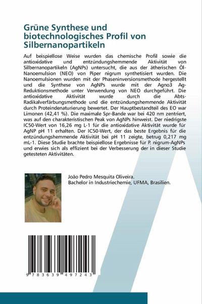 Auf beispiellose Weise wurden das chemische Profil sowie die antioxidative und entzündungshemmende Aktivität von Silbernanopartikeln (AgNPs) untersucht, die aus der ätherischen Öl-Nanoemulsion (NEO) von Piper nigrum synthetisiert wurden. Die Nanoemulsionen wurden mit der Phaseninversionsmethode hergestellt und die Synthese von AgNPs wurde mit der Agno3 Ag-Reduktionsmethode unter Verwendung von NEO durchgeführt. Die antioxidative Aktivität wurde durch die Abts-Radikalverfärbungsmethode und die entzündungshemmende Aktivität durch Proteindenaturierung bewertet. Der Hauptbestandteil des EO war Limonen (42,41 %). Die maximale Spr-Bande war bei 420 nm zentriert, was auf den charakteristischen Peak von AgNPs hinweist. Der niedrigste IC50-Wert von 16,26 mg L-1 für die antioxidative Aktivität wurde für AgNP pH 11 erhalten. Der IC50-Wert, der das beste Ergebnis für die entzündungshemmende Aktivität bei pH 11 zeigte, betrug 0,217 mg mL-1. Diese Studie brachte beispiellose Ergebnisse für P. nigrum-AgNPs und erwies sich als effizient bei der Verbesserung der in dieser Studie getesteten Aktivitäten.