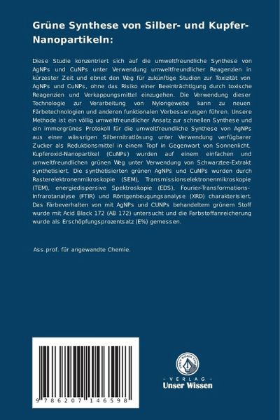 Diese Studie konzentriert sich auf die umweltfreundliche Synthese von AgNPs und CuNPs unter Verwendung umweltfreundlicher Reagenzien in kürzester Zeit und ebnet den Weg für zukünftige Studien zur Toxizität von AgNPs und CuNPs, ohne das Risiko einer Beeinträchtigung durch toxische Reagenzien und Verkappungsmittel einzugehen. Die Verwendung dieser Technologie zur Verarbeitung von Nylongewebe kann zu neuen Färbetechnologien und anderen funktionalen Verbesserungen führen. Unsere Methode ist ein völlig umweltfreundlicher Ansatz zur schnellen Synthese und ein immergrünes Protokoll für die umweltfreundliche Synthese von AgNPs aus einer wässrigen Silbernitratlösung unter Verwendung verfügbarer Zucker als Reduktionsmittel in einem Topf in Gegenwart von Sonnenlicht. Kupferoxid-Nanopartikel (CuNPs) wurden auf einem einfachen und umweltfreundlichen grünen Weg unter Verwendung von Schwarztee-Extrakt synthetisiert. Die synthetisierten grünen AgNPs und CuNPs wurden durch Rasterelektronenmikroskopie (SEM), Transmissionselektronenmikroskopie (TEM), energiedispersive Spektroskopie (EDS), Fourier-Transformations-Infrarotanalyse (FTIR) und Röntgenbeugungsanalyse (XRD) charakterisiert. Das Färbeverhalten von mit AgNPs und CUNPs behandeltem grünem Stoff wurde mit Acid Black 172 (AB 172) untersucht und die Farbstoffanreicherung wurde als Erschöpfungsprozentsatz (E%) gemessen.