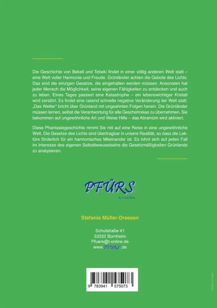Plötzlich passiert eine Katastrophe in Grünland, in einer Welt voller Harmonie und Freude. Bekell und Tebeki machen sich auf die Suche nach der Ursache und werden fündig. Diese Geschichte kann zum reinen Vergnügen gelesen werden, soll aber gleichzeitig zum Nachdenken anregen. Im hinteren Teil des Buches gibt es Fragestellungen, die zum Beispiel auch zur Textanalyse genutzt werden können.