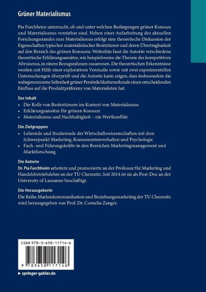 Pia Furchheim untersucht, ob und unter welchen Bedingungen grüner Konsum und Materialismus vereinbar sind. Neben einer Aufarbeitung des aktuellen Forschungsstandes zum Materialismus erfolgt eine theoretische Diskussion der Eigenschaften typischer materialistischer Besitztümer und deren Übertragbarkeit auf den Bereich des grünen Konsums. Weiterhin fasst die Autorin verschiedene theoretische Erklärungsansätze, wie beispielsweise die Theorie des kompetitiven Altruismus, in einem Bezugsrahmen zusammen. Die theoretischen Erkenntnisse werden mit Hilfe einer explorativen Vorstudie sowie mit zwei experimentellen Untersuchungen überprüft und die Autorin kann zeigen, dass insbesondere die wahrgenommene Seltenheit grüner Persönlichkeitsmerkmale einen entscheidenden Einfluss auf die Produktpräferenz von Materialisten hat.