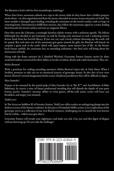 The librarian is back with her first misanthropic anthology! When three brave astronauts embark on a trip to the moon, little do they know that a hidden purpose awaits them—an alien signal detected from the moon, shrouded in secrecy to prevent panic on Earth. The lunar module is damaged upon landing, stranding the astronauts on the moon's surface, with no hope of returning home. Determined to fulfill their mission, they follow the mysterious signal to a crater, leading them beneath the moon's surface and into an enigmatic library. Here they meet the Librarian, a seemingly harmless elderly woman with a nefarious agenda. The bilious bibliosoph has decided to put humanity on trial by forcing each astronaut to read a sickening science fiction book from her liverish library. If just one can read a book without throwing up, the earth will be spared. But each time one of the astronauts gets green around the gills, the librarian will launch, by catapult, a giant rock at the earth, which will, upon impact, cause massive loss of life. As the bizarre book bazaar unfolds, the astronauts face an unsettling realization—the final rock will bring about the destruction of Earth. Along with the frame narrative by J. Manfred Weichsel, Gruesome Futures features stories by three acclaimed authors renowned for their ability to invoke revulsion, dread, and a dark fascination. They are: Misha Burnett! With a penchant for crafting unsettling narratives, Misha Burnett's latest tale, It Only Hurts When I Swallow, promises to take you on an emotional journey of grotesque beauty. In this slice of new wave fiction, Burnett's twisted imagination births scenes of judicial punishment that will be difficult to digest. Max Gunssler! Prepare to be ensnared by the putrid pulp of Max Gunssler, for in The R*** and Annihilation of Babe Babylonia, he weaves a story of future professional wrestling that will disturb the depths of your puny human psyche. Gunssler's uncanny ability to write gonzo, off-the-wall action scenes will leave you breathless, and empty your stomach. Todd Love! In The Secret on Subfloor 82 of Serenity Station, Todd Love offers readers an unforgiving plunge into the darkest recesses of the human condition. In this piece of Grimdark MilFic action, Love's exploration of the grotesque serves as a reflection of our own flawed existence, challenging you to unearth the true horrors that lie within… within your gut, that is. Gruesome Futures will invade your nightmares and make you sick. Can you read this digest of disgust without throwing up? Do you take the challenge?