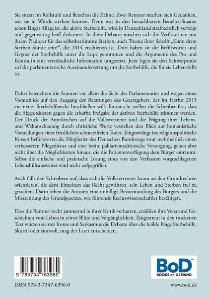Sie sitzen im Rollstuhl und fletschen die Zähne: Zwei Rentner machen sich Gedanken, wie sie in Würde sterben können. Denn was in den benachbarten Benelux-Staaten schon längst Alltag ist, die aktive Sterbehilfe, wird in Deutschland strafrechtlich verfolgt und gegenwärtig heiß diskutiert. In diese Debatte mischen sich die Verfasser ein mit ihrem Plädoyer für das selbstbestimmte Sterben, auch Thema ihrer Schrift "Kann denn Sterben Sünde sein?", die 2014 erschienen ist. Dort haben sie die Befürworter und Gegner der Sterbehilfe unter die Lupe genommen und die Argumente des Pro und Kontra in eine verständliche Information umgesetzt. Jetzt legen sie den Schwerpunkt auf die parlamentarische Auseinandersetzung um die Sterbehilfe, die für sie Lebenshilfe ist. Dabei beleuchten die Autoren vor allem die Sicht der Parlamentarier und wagen einen Vorausblick auf den Ausgang der Beratungen des Gesetzgebers, der im Herbst 2015 ein neues Sterbehilferecht beschließen will. Enttäuscht stellen die Schreiber fest, dass die Abgeordneten gegen die erhoffte Freigabe der aktiven Sterbehilfe stimmen werden. Der Druck der Amtskirchen auf die Volksvertreter und die Prägung ihrer Lebens- und Weltanschauung durch christliche Werte verstellen den Blick auf humanistische Vorstellungen eines friedlichen schmerzfreien Todes. Eingezwängt ins religionspolitische Korsett befürworten die Mitglieder des Deutschen Bundestags zwar mehrheitlich einen verbesserten Pflegedienst und eine breite palliativmedizinische Versorgung, gehen aber nicht über die Möglichkeiten hinaus, die die Patientenverfügung dem Bürger einräumt. Selbst die einfache und praktische Lösung eines von den Verfassern vorgeschlagenen Lebenshilfeausweises wird nicht aufgegriffen. Auch fällt den Schreibern auf, dass sich die Volksvertreter kaum an den Grundrechten orientieren, die dem Einzelnen das Recht gewähren, sein Leben und Sterben frei zu gestalten. Darin sehen die Autoren eine unbillige Bevormundung des Bürgers und die Missachtung des Grundgesetzes, wie führende Rechtswissenschaftler bestätigen. Dass die Rentner nicht jammernd in ihrer Kritik verharren, erzählen ihre Verse und Geschichten vom Leben in seiner Blüte und Vergänglichkeit. Eingestreut in den trockenen Text würzen sie mit Ironie und Sarkasmus die Debatte über die heikle Frage Sterbehilfe. Skurril oder sinnvoll, mag der Leser entscheiden.