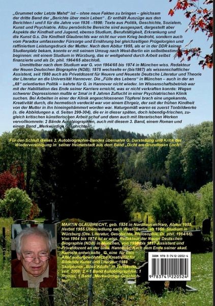 "Grummet oder Letzte Mahd" ist - ohne neue Fakten zu bringen - gleichsam der dritte Band der "Berichte über mein Leben". Er enthält Auszüge aus den Berichten I und II für die Jahre von 1936 -1998: Texte aus Politik, Geschichte, Sozialem, Kunst und Psychiatrie. Allzu persönliche Bereiche sind ausgespart, dargestellt aber Aspekte der Kindheit und Jugend, ebenso Studium, Berufstätigkeit, Erkrankung und die Kunst G.s. Die Kindheit Glaubrechts war nicht nur vom Krieg bedroht, sondern auch vom Paradox umfassender Fürsorge und Ernährung bei gleichzeitigen Prügelorgien und raffiniertem Leistungsdruck der Mutter. Nach dem Abitur 1955, als er in der DDR keinen Studienplatz bekam, konnte er mit seinem Umzug nach West-Berlin ein selbstbestimmtes Leben beginnen: mit einem Studium in Würzburg, das er weitgehend durch Arbeit selbst finanzierte und als Dr. phil. 1964/65 abschloss. Unmittelbar nach dem Studium war G. von 1964/65 bis 1974 in München wiss. Redakteur der Neuen Deutschen Biographie (NDB); 1975 wechselte er (bis1987) als wissenschaftlicher Assistent, seit 1980 auch als Privatdozent für Neuere und Neueste Deutsche Literatur und Theorie der Literatur an die Universität Hannover. Die "Fülle des Lebens" in München - auch in der an "68" orientierten Politik - kehrte für G. in Hannover nicht wieder. Im Wissenschaftsbetrieb war mit der Habilitation das Ende seiner Karriere erreicht, was er nicht verkraften konnte: Wegen schwerer Depressionen musste er 2mal in 8 Jahren Zuflucht in einer Psychiatrischen Klinik suchen. Bei Arbeiten in einer der Klinik angeschlossenen Töpferei brach eine ungekannte, Kreativität durch, die hermetisch verdeckt war von einem Ehrgeiz, der seit der frühen Kindheit von der Mutter in ihn hineingehämmert worden war. Naturgemäß waren es zuerst Tonbildwerke (s. die Abbildungen a. d. Seiten 299-304), die er in dieser späten, doch lebendig-frischen, zu- gleich kritischen künstlerischen Arbeit schuf und dann in auch mit literarischen Werken vervollkommnete: 2 Bände Autobiographien, auch mit diesem 3. Band, einem Roman und einem Band "Merkwürdige Geschichten". Für den Schluss dieses 3. Autobiographie-Bandes übernahm G. Darstellung und Kritik der Wiedervereinigung in seiner Heimatstadt aus dem Band "Dicht am Grundlosen Loch".