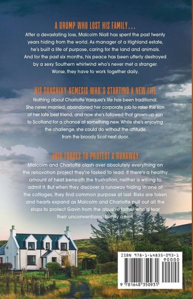A grump who lost his family... After a devastating loss, Malcolm Niall has spent the past twenty years hiding from the world. As manager of a Highland estate, he's built a life of purpose, caring for the land and animals. And for the past six months, his peace has been utterly destroyed by a sexy Southern whirlwind who's never met a stranger. Worse, they have to work together daily. His sunshiny nemesis who's starting a new life Nothing about Charlotte Vasquez's life has been traditional. She never married, abandoned her corporate job to raise the son of her late best friend, and now she's followed that grown-up son to Scotland for a chance at something new. While she's enjoying the challenge, she could do without the attitude from the broody Scot next door. Join forces to protect a runaway Malcolm and Charlotte clash over absolutely everything on the renovation project they're tasked to lead. If there's a healthy amount of heat beneath the frustration, neither is willing to admit it. But when they discover a runaway hiding in one of the cottages, they find common purpose at last. Risks are taken and hearts expand as Malcolm and Charlotte pull out all the stops to protect Gavin from the abusive father who'd tear their unconventional family apart.