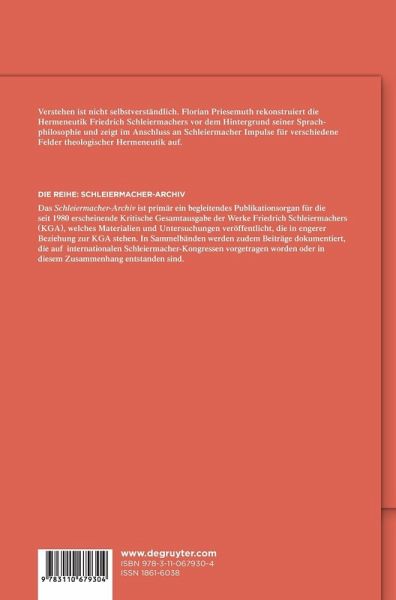 Verstehen ist nicht selbstverständlich. Florian Priesemuth rekonstruiert die Hermeneutik Friedrich Schleiermachers vor dem Hintergrund seiner Sprachphilosophie und zeigt im Anschluss an Schleiermacher Impulse für verschiedene Felder theologischer Hermeneutik auf.