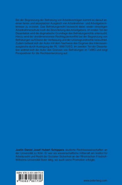 Bei der Begrenzung der Befristung von Arbeitsverträgen kommt es darauf an, einen fairen und akzeptablen Ausgleich von Arbeitnehmer- und Arbeitgeberinteresse zu erzielen. Das Befristungsrecht bezweckt dabei weder einseitigen Arbeitnehmerschutz noch die Bevorteilung des Arbeitgebers. Im ersten Teil der Dissertation wird die dogmatische Grundlage des Befristungsrechts untersucht. Hierzu wird der dreidimensionale Rechtsgüterkonflikt bei der Begrenzung von Befristungen auf Ebene der Verfassung und der Unionsgrundrechte beleuchtet. Zudem befasst sich der Autor mit dem Nachweis des Dogmas des Interessenausgleichs durch Auslegung der RL 1999/70/EG. Im zweiten Teil der Dissertation widmet sich der Autor den Grenzen von Befristungen im TzBfG und zeigt Perspektiven für die Rechtsentwicklung auf.