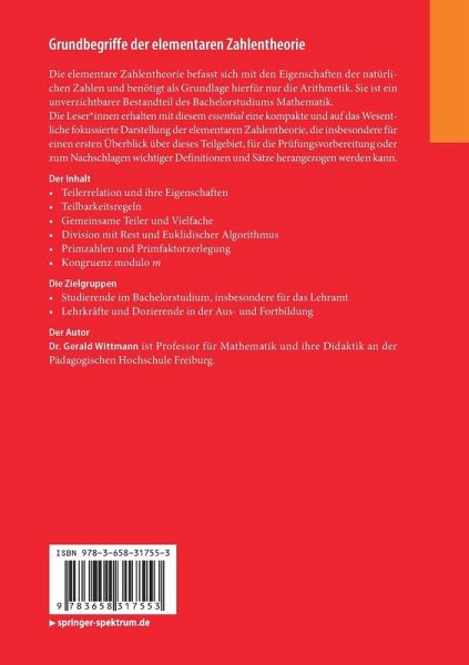 Die Leser_innen erhalten mit diesem essential eine kompakte und auf das Wesentliche fokussierte Darstellung der elementaren Zahlentheorie, die insbesondere für einen ersten Überblick über dieses Teilgebiet, für die Prüfungsvorbereitung oder zum Nachschlagen wichtiger Definitionen und Sätze herangezogen werden kann.
