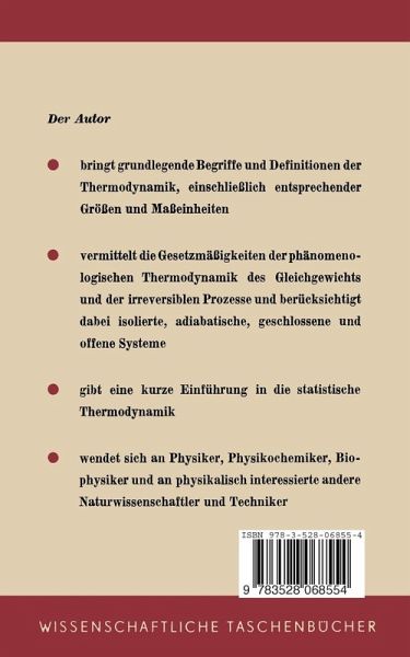 Die klassische Thermodynamik, geschaffen durch die Arbeiten vieler bedeutender Gelehrter, unter denen die deutschen Wissenschaftler eine besondere Stellung ein nahmen, erfuhr durch ihre Anwendung in vielen Gebieten der Wissenschaft und Technik eine weite Verbreitung. Ungeachtet dessen besitzt die klassische Thermodynamik nur einen begrenzten Anwendungsbereich, da sie sich auf die Beschreibung der Gleichgewichtsprozesse be schränkt, der größte Teil der realen physikalischen, chemischen und biologischen Prozesse jedoch irrever sibel verläuft. Gegenwärtig wird auf dem Gebiet der Thermodynamik der irreversiblen Prozesse mit wachsen der Intensität gearbeitet. Es besteht die berechtigte Hoffnung, daß in nicht allzu ferner Zukunft eine thermo dynamische Theorie entstehen wird, welche die Mehrheit der in der Natur ablaufenden irreversiblen Prozesse umfaßt. Es ist deshalb erforderlich, die jungen heran wachsenden Wissenschaftler mit dem Problemkreis der Thermodynamik vertraut zu machen. Dazu wird, wie ich meine, dieses Taschenbuch von Dieter Leuschner "Grundbegriffe der Thermodynamik" beitragen. Das Buch macht den Leser in knapper und verständ licher Form sowohl mit den Grundlagen der klassischen Thermodynamik als auch mit einigen gegenwärtigen Problemen der linearen und nichtlinearen thermo dynamischen irreversiblen Prozesse bekannt. Die für die Thermodynamik charakteristischen Methoden und Verfahren der Beweisführung werden ausführlich be schrieben. Es wird kurz auf die Anwendungsgebiete der klassischen Thermodynamik und auf die Bereiche, in 6 Geleitwort denen eine Nutzung der heutigen Thermodynamik möglich ist, eingegangen. So können aus diesem Buch die Anfangskenntnisse geschöpft werden, die den Zu gang zur modernen Thermodynamikermöglichen.