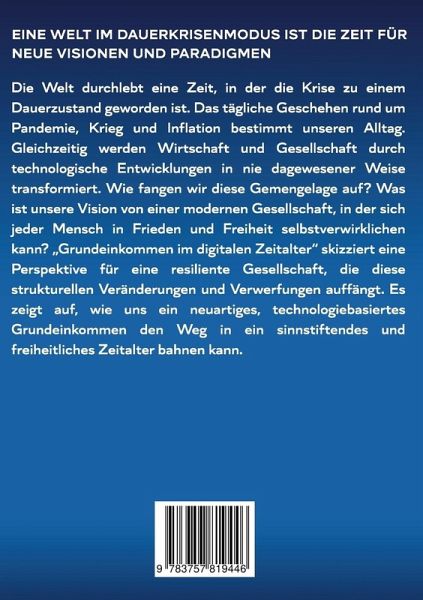 Eine Welt im Dauerkrisenmodus ist die Zeit für neue Visionen und ParadigmenDie Welt durchlebt eine Zeit, in der die Krise zu einem Dauerzustand geworden ist. Das tägliche Geschehen rund um Pandemie, Krieg und Inflation bestimmt unseren Alltag. Gleichzeitig werden Wirtschaft und Gesellschaft durch technologische Entwicklungen in nie dagewesener Weise transformiert. Der rapide Erfolg von ChatGPT und Co. ist dabei erst der Beginn eines neuen Zeitalters. Wie fangen wir diese Gemengelage auf? Was ist unsere Vision von einer modernen Gesellschaft, in der sich jeder Mensch in Frieden und Freiheit selbstverwirklichen kann? »Grundeinkommen im digitalen Zeitalter« skizziert eine Perspektive für eine resiliente Gesellschaft, die diese strukturellen Veränderungen und Verwerfungen auffängt. Es zeigt auf, wie uns ein neuartiges, technologiebasiertes Grundeinkommen den Weg in ein sinnstiftendes und freiheitliches Zeitalter bahnen kann.