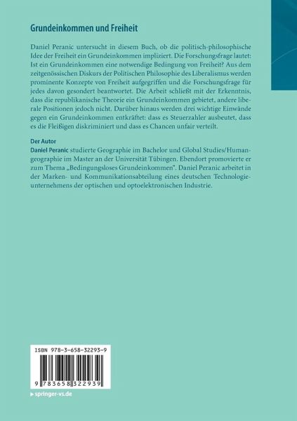 Daniel Peranic untersucht in diesem Buch, ob die politisch-philosophische Idee der Freiheit ein Grundeinkommen impliziert. Die Forschungsfrage lautet: Ist ein Grundeinkommen eine notwendige Bedingung von Freiheit? Aus dem zeitgenössischen Diskurs der Politischen Philosophie des Liberalismus werden prominente Konzepte von Freiheit aufgegriffen und die Forschungsfrage für jedes davon gesondert beantwortet. Die Arbeit schließt mit der Erkenntnis, dass die republikanische Theorie ein Grundeinkommen gebietet, andere liberale Positionen jedoch nicht. Darüber hinaus werden drei wichtige Einwände gegen ein Grundeinkommen entkräftet: dass es Steuerzahler ausbeutet, dass es die Fleißigen diskriminiert und dass es Chancen unfair verteilt.