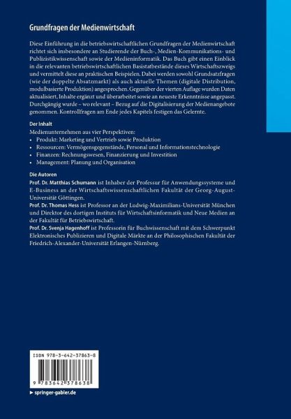 Prof. Dr. Matthias Schumann, Jahrgang 1959, ist seit 1991 Inhaber der Professur für Anwendungssysteme und E-Business an der Wirtschaftswissenschaftlichen Fakultät der Georg-August-Universität Göttingen. Daneben leitet er das Wirtschafts- und Sozialwissenschaftliche Rechenzentrum. Von 2001 bis 2005 war er Vizepräsident der Universität Göttingen. Seine Forschungsarbeiten konzentrieren sich auf Anwendungen der Informations- und Kommunikationstechnik, innerbetrieblich, zwischenbetrieblich sowie zwischen Unternehmen und privaten Haushalten. Daneben beschäftigt er sich mit konvergenten Märkten der Internet-Technologie sowie der IT-Unterstützung des Bildungs- und Wissensmanagements. Er ist Autor zahlreicher Lehr- und Fachbücher sowie Zeitschriftenartikel und Mitherausgeber verschiedener Zeitschriften. Prof. Dr. Thomas Hess, geboren 1967, ist seit 2001 Professor an der Ludwig-Maximilians-Universität München (LMU) und Direktor des dortigen Instituts für Wirtschaftsinformatik und Neue Medien. Zudem ist er Sprechen des Münchner Zentrums für Internetforschung und Medienintegration. Sein Forschungsfeld liegt im Wandel von Unternehmen durch Informations- und Kommunikationstechnologien mit einem Schwerpunkt auf der Digitalisierung der Medienbranche. Zu diesem Thema hat er in den letzten Jahren zahlreiche Artikel in renommierten Fachzeitschriften publiziert sowie auf Konferenzen vorgestellt. Auch ist Prof. Hess Autor von zahlreichen Lehr- und Fachbüchern zur Digitalisierung sowie Mitherausgeber von Fachzeitschriften zum Medienmanagement. Prof. Dr. Svenja Hagenhoff, geboren 1971, ist seit 2011 Professorin für Buchwissenschaft, insbesondere Elektronisches Publizieren und Digitale Märkte an der Friedrich-Alexander-Universität Erlangen-Nürnberg. Sie ist dort Mitglied des Vorstands des Interdisziplinären Zentrums für Digital Humanities and Social Sciences sowie Sprecherin der Kollegialen Leitung desDepartments für Medienwissenschaften und Kunstgeschichte. Zuvor war sie Leiterin des Forschungsinstituts für Medienwirtschaft an der Fachhochschule St. Pölten in Österreich. Promotion und Habilitation stammen aus Gebieten der Wirtschaftsinformatik und BWL. Ihre Kernarbeitsgebiete in Erlangen sind die Medienwirtschaft mit Fokus auf Schriftmedien sowie anwendungsbezogene Technologieaspekte in dieser Domäne. Sie ist Autorin zahlreicher Fachartikel sowie zusammen mit Matthias Schumann und weiteren Kollegen Herausgeberin der Göttinger Schriften zur Internetforschung.