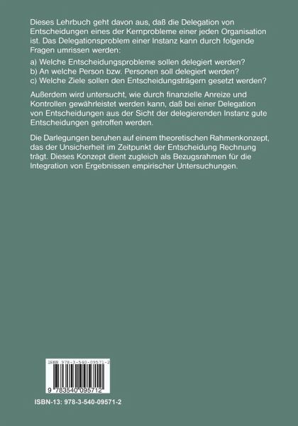 I. Einleitung.- 1. Problemstellung.- 2. Bemerkungen zum Stand der Forschung.- 3. Das eigene Vorgehen.- 4. Zusammenfassung.- II. Allgemeine Grundlagen.- 1. Vorbemerkung.- 2. Entscheidungstheoretische Grundlagen.- 3. Führungsstile.- 4. Bestimmungsgrößen für die Vorteilhaftigkeit der Delegation der Entscheidung.- 5. Grundprobleme der Delegation.- 6. Zusammenfassung.- III. Präzisierung der Problemstellung für die weitere Untersuchung.- 1. Die Notwendigkeit der Vorstrukturierung der Entscheidungssituation.- 2. Die betrachtete Entscheidungssituation.- 3. Zur Zielvorgabe bei Delegation.- 4. Offene Probleme.- 5. Die Bestimmung eines optimalen Führungsstils als Entscheidungsproblem bei Unsicherheit.- 6. Grundbegriffe.- 7. Zum Ablauf des Entscheidungsprozesses.- 8. Zur Funktion der entwickelten Modelle.- 9. Der weitere Aufbau der Arbeit.- 10. Zusammenfassung.- IV. Entscheidung durch die Instanz.- 1. Entscheidung ohne Information (Führungsstil A).- 2. Entscheidung mit Information (Führungsstil B).- 3. Zusammenfassung.- V. Ein Rahmenmodell zur Analyse des Delegationswertes.- 1. Problemstellung.- 2. Die Bestimmung des Wertes einer Delegation.- 3. Die Höhe des Delegationswertes.- 4. Zur Bestimmung der (bedingten) Wahrscheinlichkeit p (AaSs).- 5. Zusammenfassung.- VI. Delegation der Entscheidung als Ganzes an einen Entscheidungsträger (Führungsstil C).- 1. Grundlagen.- 2. Delegation zur Nutzung der Informationen des Entscheidungsträgers bei ausreichendem Sachverstand der Instanz.- 3. Delegation bei unzureichendem Sachverstand der Instanz.- 4. Zusammenfassung.- VII. Zerlegung des Entscheidungsproblems und Delegation an mehrere Entscheidungsträger (Führungsstil D).- 1. Grundlagen.- 2. Unabhängige Teilbereiche.- 3. Abhängige Teilbereiche.- 4. Kommunikation zwischen denEntscheidungsträgern.- 5. Führungsstil D vs. Führungsstil A.- 6. Führungsstil D vs. Führungsstil B.- 7. Führungsstil D vs. Führungsstil C.- 8. Zusammenfassung.- VIII. Delegation der Entscheidung als Ganzes an eine Gruppe (Führungsstil E).- 1. Grundlagen.- 2. Das Wahrscheinlichkeitsmodell von Hofstätter.- 3. Das Grundmodell zur Bestimmung des Delegationswertes.- 4. Varianten des Grundmodells für zwei Handlungsalternativen.- 5. Eine Variante des Grundmodells für mehr als zwei Handlungsalternativen.- 6. Die Höhe des Delegationswertes.- 7. Die Wahl der Abstimmungsregel als Entscheidungsproblem.- 8. Delegation vs. Entscheidung durch die Instanz nach Information durch die Gruppe.- 9. Delegation an eine Gruppe vs. Delegation an einen Einzelnen.- 10. Delegation an eine Gruppe im Lichte empirischer Untersuchungen.- 11. Nochmals: Zur Höhe des Delegationswertes.- 12. Zusammenfassung.- IX. Einsatz eines Stabes (Führungsstil F).- 1. Grundlagen.- 2. Mögliche Beiträge des Stabes.- 3. Die betrachteten Führungsstile.- 4. Vergleich der Führungsstile.- 5. Zusammenfassung.- X. Kontrolle.- 1. Grundlagen.- 2. Ergebniskontrolle (gewinnorientierter Soll-Ist-Vergleich).- 3. Planungskontrolle.- 4. Kontrolle als Entscheidungsproblem.- 5. Zusammenfassung.- XI. Finanzielle Anreizsysteme: Gewinnabhängige Prämien.- 1. Zweck und Grundprobleme eines Anreizsystems.- 2. Delegation an einen Entscheidungsträger.- 3. Delegation an eine Gruppe.- 4. Zusammenfassung.- Anhang 1.- Anhang 2.- Stichwortverzeichnis.