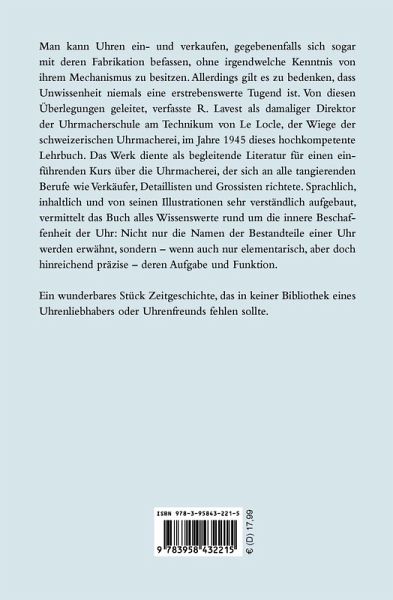 Unverzichtbares Handbuch für Uhrenbastler, Uhrensammler und UhrenliebhaberEine Fundgrube des Wissens für die Reparatur alter UhrenDas Standardwerk für die UhrenmacherlehreMan kann Uhren ein- und verkaufen, gegebenenfalls sich sogar mit deren Fabrikation befassen, ohne irgendwelche Kenntnis von ihrem Mechanismus zu besitzen. Allerdings gilt es zu bedenken, dass Unwissenheit niemals eine erstrebenswerte Tugend ist. Von diesen Überlegungen geleitet, verfasste R. Lavest als damaliger Direktor der Uhrmacherschule am Technikum von Le Locle, der wiege der schweizerischen Uhrmacherei, im Jahre 1945 dieses hochkompetente Lehrbuch. Das Werk diente als begleitende Literatur für einen einführenden Kurs über die Uhrmacherei, der sich an alle tangierenden Berufe wie Verkäufer, Detaillisten und Grossisten richtete. Sprachlich, inhaltlich und von seinen Illustrationen sehr verständlich aufgebaut, vermittelt das Buch alles Wissenswerte rund um die innere Beschaffenheit der Uhr: Nicht nur die Namen der Bestandteile einer Uhr werden erwähnt, sondern - wenn auch nur elementarisch, aber doch hinreichend präzise - deren Aufgabe und Funktion.Ein wunderbares Stück Zeitgeschichte, das in keiner Bibliothek eines Uhrenliebhabers oder Uhrenfreunds fehlen sollte.Der Titel ist in der Reihe der Uhrmacher-Reprints aus dem HEEL Verlag erschienen, die sich unter Uhrmachern und Bastlern großer Beliebtheit erfreuen:Die Uhr und Ihre FunktionenDer Uhrmacher am WerktischPorträt einer TaschenuhrLeitfaden für die UhrmacherlehreDie GroßuhrGrundriss vom Aufbau einer Uhr