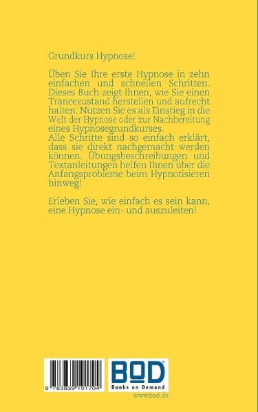 Grundkurs Hypnose!Üben Sie Ihre erste Hypnose in zehn einfachen und schnellen Schritten. Dieses Buch zeigt Ihnen, wie Sie einen Trancezustand herstellen und aufrecht halten. Nutzen Sie es als Einstieg in die Welt der Hypnose oder zur Nachbereitung eines Hypnosegrundkurses. Alle Schritte sind so einfach erklärt, dass sie direkt nachgemacht werden können. Übungsbeschreibungen und Textanleitungen helfen Ihnen über die Anfangsprobleme beim Hypnotisieren hinweg! Erleben Sie, wie einfach es sein kann, eine Hypnose ein- und auszuleiten!