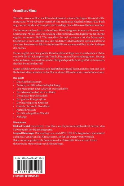 Michael Hantel (emeritiert, von Haus aus Experimentalphysiker) betreut den Schwerpunkt der Haushaltsgesetze. Leopold Haimberger (IPCC-2013-Beitragsautor), spezialisiert auf globale Analysen des Klimasystems, ist für die Daten verantwortlich. Beide Autoren gehören als Professoren der Universität Wien an und lehren im Fach theoretische Meteorologie.