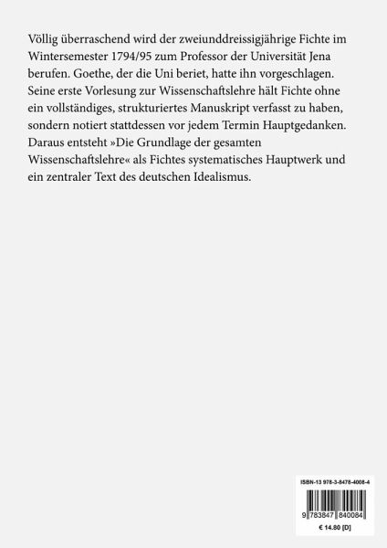 Johann Gottlieb Fichte: Grundlage der gesammten Wissenschaftslehre Lesefreundlicher Großdruck in 16-pt-Schrift Völlig überraschend wird der zweiunddreissigjährige Fichte im Wintersemester 1794/95 zum Professor der Universität Jena berufen. Goethe, der die Uni beriet, hatte ihn vorgeschlagen. Seine erste Vorlesung zur Wissenschaftslehre hält Fichte ohne ein vollständiges, strukturiertes Manuskript verfasst zu haben, sondern notiert stattdessen vor jedem Termin Hauptgedanken. Daraus entsteht »Die Grundlage der gesamten Wissenschaftslehre« als Fichtes systematisches Hauptwerk und ein zentraler Text des deutschen Idealismus. Großformat, 210 x 297 mm Berliner Ausgabe, 2019 Durchgesehener Neusatz mit einer Biographie des Autors bearbeitet und eingerichtet von Theodor Borken Erstdruck: Jena (Gabler) 1794/95; 2. verbesserte Ausgabe: Jena (Gabler) 1802. Der Text folgt der ersten Ausgabe, Veränderungen bzw. Zusätze der 2. Ausgabe erscheinen in den Fußnoten. Textgrundlage ist die Ausgabe: Johann Gottlieb Fichtes sämmtliche Werke. Herausgegeben von I. H. Fichte, Band 1-8, Berlin: Veit & Comp., 1845/1846. Dieses Buch folgt in Rechtschreibung und Zeichensetzung obiger Textgrundlage. Umschlaggestaltung von Thomas Schultz-Overhage. Gesetzt aus der Minion Pro, 16 pt. Henricus Edition Deutsche Klassik UG (haftungsbeschränkt)