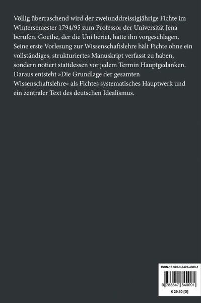 Johann Gottlieb Fichte: Grundlage der gesammten Wissenschaftslehre Lesefreundlicher Großdruck in 16-pt-Schrift Völlig überraschend wird der zweiunddreissigjährige Fichte im Wintersemester 1794/95 zum Professor der Universität Jena berufen. Goethe, der die Uni beriet, hatte ihn vorgeschlagen. Seine erste Vorlesung zur Wissenschaftslehre hält Fichte ohne ein vollständiges, strukturiertes Manuskript verfasst zu haben, sondern notiert stattdessen vor jedem Termin Hauptgedanken. Daraus entsteht »Die Grundlage der gesamten Wissenschaftslehre« als Fichtes systematisches Hauptwerk und ein zentraler Text des deutschen Idealismus. Großformat, 210 x 297 mm Berliner Ausgabe, 2019 Durchgesehener Neusatz mit einer Biographie des Autors bearbeitet und eingerichtet von Theodor Borken Erstdruck: Jena (Gabler) 1794/95; 2. verbesserte Ausgabe: Jena (Gabler) 1802. Der Text folgt der ersten Ausgabe, Veränderungen bzw. Zusätze der 2. Ausgabe erscheinen in den Fußnoten. Textgrundlage ist die Ausgabe: Johann Gottlieb Fichtes sämmtliche Werke. Herausgegeben von I. H. Fichte, Band 1-8, Berlin: Veit & Comp., 1845/1846. Dieses Buch folgt in Rechtschreibung und Zeichensetzung obiger Textgrundlage. Umschlaggestaltung von Thomas Schultz-Overhage. Gesetzt aus der Minion Pro, 16 pt.