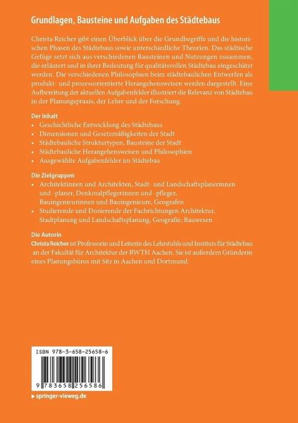 Christa Reicher gibt einen Überblick über die Grundbegriffe und die historischen Phasen des Städtebaus sowie unterschiedliche Theorien. Das städtische Gefüge setzt sich aus verschiedenen Bausteinen und Nutzungen zusammen, die erläutert und in ihrer Bedeutung für qualitätsvollen Städtebau eingeschätzt werden. Die verschiedenen Philosophien beim städtebaulichen Entwerfen als produkt- und prozessorientierte Herangehensweisen werden dargestellt. Eine Aufbereitung der aktuellen Aufgabenfelder illustriert die Relevanz von Städtebau in der Planungspraxis, der Lehre und der Forschung.