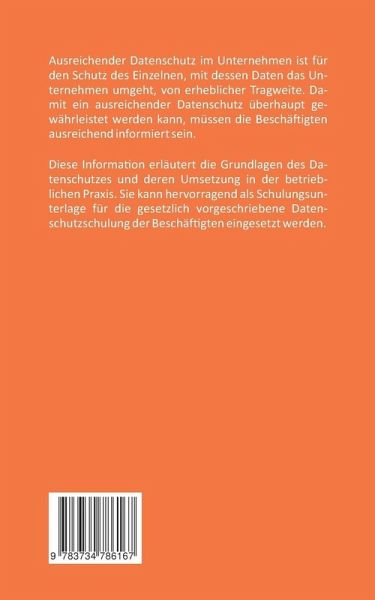 Ausreichender Datenschutz im Unternehmen ist für den Schutz des Einzelnen, mit dessen Daten das Unternehmen umgeht, von erheblicher Tragweite. Damit ein ausreichender Datenschutz überhaupt gewährleistet werden kann, müssen die Beschäftigten ausreichend informiert sein.Diese Information erläutert die Grundlagen des Datenschutzes und deren Umsetzung in der betrieblichen Praxis. Sie kann hervorragend als Schulungsunterlage für die gesetzlich vorgeschriebene Datenschutzschulung der Beschäftigten eingesetzt werden.