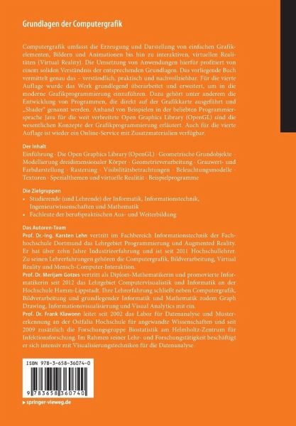 Computergrafik umfasst die Erzeugung und Darstellung von einfachen Grafikelementen, Bildern und Animationen bis hin zu interaktiven, virtuellen Realitäten (Virtual Reality). Die Umsetzung von Anwendungen hierfür profitiert von einem soliden Verständnis der entsprechenden Grundlagen. Das vorliegende Buch vermittelt genau das - verständlich, praktisch und nachvollziehbar. Für die vierte Auflage wurde das Werk grundlegend überarbeitet und erweitert, um in die moderne Grafikprogrammierung einzuführen. Dazu gehört unter anderem die Entwicklung von Programmen, die direkt auf der Grafikkarte ausgeführt und "Shader" genannt werden. Anhand von Beispielen in der beliebten Programmiersprache Java für die weit verbreitete Open Graphics Library (OpenGL) sind die wesentlichen Konzepte der Grafikprogrammierung erläutert. Auch für die vierte Auflage ist wieder ein Online-Service mit Zusatzmaterialien verfügbar.