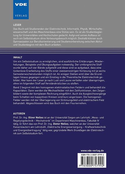 Um ein Selbststudium zu ermöglichen, sind ausführliche Erklärungen, Wiederholungen, Beispiele und Übungsaufgaben notwendig. Der umfangreiche Stoff wurde daher auf vier Bände aufgeteilt und diese sind so aufgebaut, dass eine lückenlose Erarbeitung des Stoffs einer zweisemestrigen Vorlesung mit je sechs Semesterwochenstunden möglich ist. An einigen Stellen wird über die Grundlagen hinaus gegangen und ein Einstieg in die Theoretische Elektrotechnik gebildet. Hier kann der Leser je nach Lust und Laune vertiefen oder überspringen, ohne im folgenden Stoff auf Verständnislücken zu stoßen.Band 2 beginnt mit den homogenen elektrostatischen Feldern und behandelt die Kapazitäten. Dann werden die Wechselfelder mit den Zeitfunktionen, den Zeigerbildern sowie der komplexen Rechnung eingeführt. Auch die Ausgleichsvorgänge beim Schalten von kapazitiven Kreisen sind kurz angerissen. Die homogenen Felder werden mit der Überlagerung von Strömungsfeld und elektrischem Feld behandelt. Abgeschlossen wird das Buch mit den Fourierreihen.