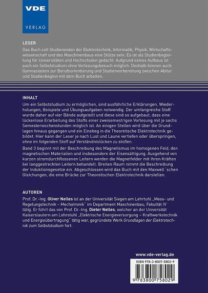 Um ein Selbststudium zu ermöglichen, sind ausführliche Erklärungen, Wiederholungen, Beispiele und Übungsaufgaben notwendig. Der umfangreiche Stoff wurde daher auf vier Bände aufgeteilt und diese sind so aufgebaut, dass eine lückenlose Erarbeitung des Stoffs einer zweisemestrigen Vorlesung mit je sechs Semesterwochenstunden möglich ist. An einigen Stellen wird über die Grundlagen hinaus gegangen und ein Einstieg in die Theoretische Elektrotechnik gebildet. Hier kann der Leser je nach Lust und Laune vertiefen oder überspringen, ohne im folgenden Stoff auf Verständnislücken zu stoßen.Band 3 beginnt mit der Beschreibung des Magnetismus im homogenen Feld, den magnetischen Materialien und insbesondere der Eisensättigung. Ausgehend von kurzen stromdurchflossenen Leitern werden die Magnetfelder mit ihren Kräften bei langgestreckten Leitern behandelt. Breiten Raum nimmt die Beschreibung der Induktionsgesetze ein. Abgeschlossen wird das Buch mit den Maxwell´schen Gleichungen, die eine Brücke zur Theoretischen Elektrotechnik darstellen.