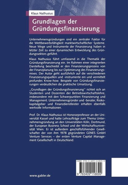 Prof. Dr. Klaus Nathusius ist Honorarprofessor an der Universität Kassel und hatte Lehraufträge zum Thema Unternehmensgründung an den Universitäten Köln, Dortmund, der European Business School und der Wirtschaftsuniversität Wien. Er ist außerdem geschäftsführender Gesellschafter der von ihm 1978 gegründeten GENES GmbH Venture Services - der ersten Venture Capital Management Gesellschaft in Deutschland.