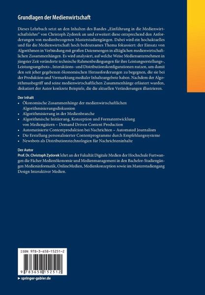 Dieses Lehrbuch setzt an den Inhalten des Bandes "Einführung in die Medienwirtschaftslehre" von Christoph Zydorek an und erweitert diese entsprechend den Anforderungen von medienbezogenen Masterstudiengängen. Dabei wird ein hochaktuelles und für die Medienwirtschaft hoch bedeutsames Thema fokussiert: der Einsatz von Algorithmen in Verbindung mit großen Datenmengen in alltäglichen medienwirtschaftlichen Zusammenhängen. Es wird analysiert, auf welche Weise Medienunternehmen in jüngster Zeit veränderte technische Rahmenbedingungen für ihre Leistungserstellungs-, Leistungsangebots-, Interaktions- und Distributionskonfigurationen nutzen, um damit den seit jeher gegebenen ökonomischen Herausforderungen zu begegnen, die sie bei der Produktion und Vermarktung medialer Inhalteangebote haben. Nachdem der Algorithmusbegriff und seine medienwirtschaftlichen Zusammenhänge erläutert wurden, diskutiert der Autor konkrete Beispiele, die die aktuellen Veränderungen illustrieren.