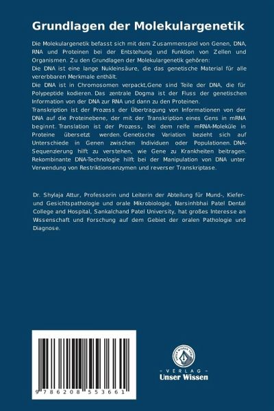 Die Molekulargenetik befasst sich mit dem Zusammenspiel von Genen, DNA, RNA und Proteinen bei der Entstehung und Funktion von Zellen und Organismen. Zu den Grundlagen der Molekulargenetik gehören:Die DNA ist eine lange Nukleinsäure, die das genetische Material für alle vererbbaren Merkmale enthält.Die DNA ist in Chromosomen verpackt,Gene sind Teile der DNA, die für Polypeptide kodieren. Das zentrale Dogma ist der Fluss der genetischen Information von der DNA zur RNA und dann zu den Proteinen.Transkription ist der Prozess der Übertragung von Informationen von der DNA auf die Proteinebene, der mit der Transkription eines Gens in mRNA beginnt. Translation ist der Prozess, bei dem reife mRNA-Moleküle in Proteine übersetzt werden. Genetische Variation bezieht sich auf Unterschiede in Genen zwischen Individuen oder Populationen. DNA-Sequenzierung hilft zu verstehen, wie Gene zu Krankheiten beitragen. Rekombinante DNA-Technologie hilft bei der Manipulation von DNA unter Verwendung von Restriktionsenzymen und reverser Transkriptase.