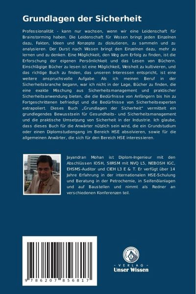 Professionalität - kann nur wachsen, wenn wir eine Leidenschaft für Brainstorming haben. Die Leidenschaft für Wissen bringt jeden Einzelnen dazu, Fakten, Ideen und Konzepte zu diskutieren, zu sammeln und zu analysieren. Der Durst nach Wissen bringt den Einzelnen dazu, mehr zu lernen und zu denken. Eine Möglichkeit, den Weg zum Erfolg zu finden, ist die Erforschung der eigenen Persönlichkeit und das Lesen von Büchern. Einschlägige Bücher zu lesen ist eine Möglichkeit, Weisheit zu kultivieren, und das richtige Buch zu finden, das unseren Interessen entspricht, ist eine weitere anspruchsvolle Aufgabe. Als ich meinen Beruf in der Sicherheitsbranche begann, war ich nicht in der Lage, Bücher zu finden, die eine exakte Mischung aus Sicherheitsmanagement und praktischer Sicherheitsanwendung bieten, die die Bedürfnisse von Anfängern bis hin zu Fortgeschrittenen befriedigt und die Bedürfnisse von Sicherheitsexperten extrapoliert. Dieses Buch "Grundlagen der Sicherheit" vermittelt ein grundlegendes Bewusstsein für Gesundheits- und Sicherheitsmanagement und die praktische Umsetzung von Sicherheit in der Industrie. Ich glaube, dass dieses Buch für die Anwärter nützlich sein wird, die ein Grundstudium oder einen Diplomstudiengang im Bereich HSE absolvieren, sowie für die allgemeinen Anwärter, die sich für den Bereich HSE interessieren.