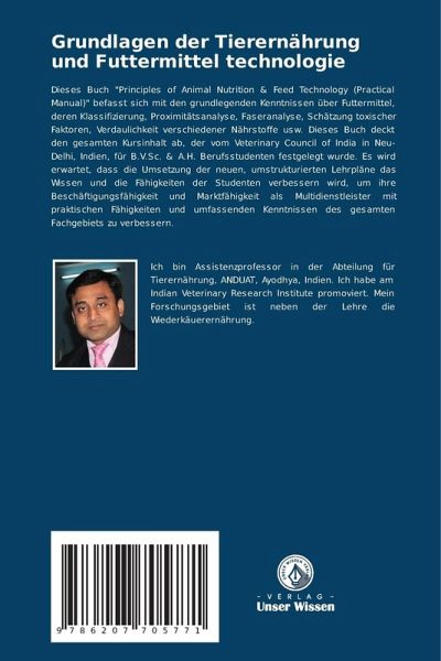 Dieses Buch "Principles of Animal Nutrition & Feed Technology (Practical Manual)" befasst sich mit den grundlegenden Kenntnissen über Futtermittel, deren Klassifizierung, Proximitätsanalyse, Faseranalyse, Schätzung toxischer Faktoren, Verdaulichkeit verschiedener Nährstoffe usw. Dieses Buch deckt den gesamten Kursinhalt ab, der vom Veterinary Council of India in Neu-Delhi, Indien, für B.V.Sc. & A.H. Berufsstudenten festgelegt wurde. Es wird erwartet, dass die Umsetzung der neuen, umstrukturierten Lehrpläne das Wissen und die Fähigkeiten der Studenten verbessern wird, um ihre Beschäftigungsfähigkeit und Marktfähigkeit als Multidienstleister mit praktischen Fähigkeiten und umfassenden Kenntnissen des gesamten Fachgebiets zu verbessern.