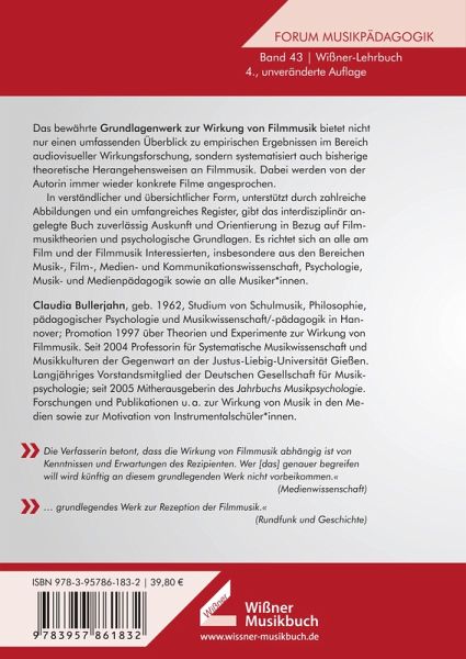 Das bewährte Grundlagenwerk zur Wirkung von Filmmusik als unveränderter Nachdruck der ersten Auflage von 2001Das Buch bietet nicht nur einen umfassenden Überblick zu empirischen Ergebnissen im Bereich audiovisueller Wirkungsforschung, sondern systematisiert auch bisherige theoretische Herangehensweisen an Filmmusik, wobei außerdem immer wieder konkrete Filme angesprochen werden. In verständlicher und übersichtlicher Form, unterstützt durch viele Abbildungen und ein umfangreiches Register, gibt das interdisziplinär angelegte Werk zuverlässig Auskunft und Orientierung in Bezug auf Filmmusiktheorien und psychologische Grundlagen. Es richtet sich an Musik-, Film-, Medien- und Kommunikationswissenschaftler, Psychologen, Musik- und Medienpädagogen, Musiker, Filmemacher sowie an alle am Film und der Filmmusik Interessierten.
