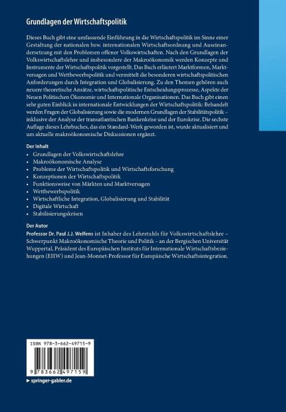 Dieses Buch gibt eine umfassende Einführung in die Wirtschaftspolitik im Sinne einer Gestaltung der nationalen bzw. internationalen Wirtschaftsordnung und Auseinandersetzung mit den Problemen offener Volkswirtschaften. Nach den Grundlagen der Volkswirtschaftslehre und insbesondere der Makroökonomik werden Konzepte und Instrumente der Wirtschaftspolitik vorgestellt. Das Buch erläutert Marktformen, Marktversagen und Wettbewerbspolitik und vermittelt die besonderen wirtschaftspolitischen Anforderungen durch Integration und Globalisierung. Zu den Themen gehören auch neuere theoretische Ansätze, wirtschaftspolitische Entscheidungsprozesse, Aspekte der Neuen Politischen Ökonomie und Internationale Organisationen. Das Buch gibt einen sehr guten Einblick in internationale Entwicklungen der Wirtschaftspolitik: Behandelt werden Fragen der Globalisierung sowie die modernen Grundlagen der Stabilitätspolitik - inklusive der Analyse der transatlantischen Bankenkrise und der Eurokrise. Die sechste Auflage dieses Lehrbuches, das ein Standard-Werk geworden ist, wurde aktualisiert und um aktuelle makroökonomische Diskussionen ergänzt.