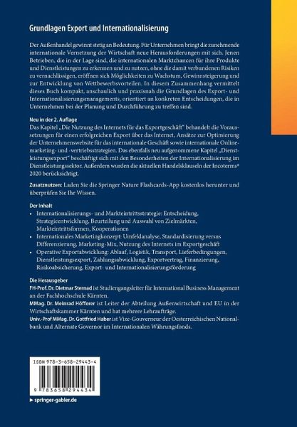 Neu in der 2. Auflage Das Kapitel "Die Nutzung des Internets für das Exportgeschäft" behandelt die Voraussetzungen für einen erfolgreichen Export über das Internet, Ansätze zur Optimierung der Unternehmenswebsite für das internationale Geschäft sowie internationale Onlinemarketing- und -vertriebsstrategien. Das ebenfalls neu aufgenommene Kapitel "Dienstleistungsexport" beschäftigt sich mit den Besonderheiten der Internationalisierung im Dienstleistungssektor. Außerdem wurden die aktuellen Handelsklauseln der Incoterms® 2020 berücksichtigt.