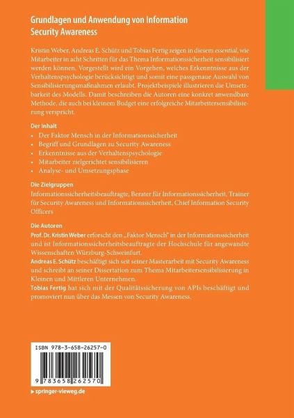 Kristin Weber, Andreas E. Schütz und Tobias Fertig zeigen in diesem essential , wie Mitarbeiter in acht Schritten für das Thema Informationssicherheit sensibilisiert werden können. Vorgestellt wird ein Vorgehen, welches Erkenntnisse aus der Verhaltenspsychologie berücksichtigt und somit eine passgenaue Auswahl von Sensibilisierungsmaßnahmen erlaubt. Projektbeispiele illustrieren die Umsetzbarkeit des Modells. Damit beschreiben die Autoren eine konkret anwendbare Methode, die auch bei kleinem Budget eine erfolgreiche Mitarbeitersensibilisierung verspricht.
